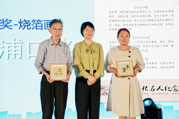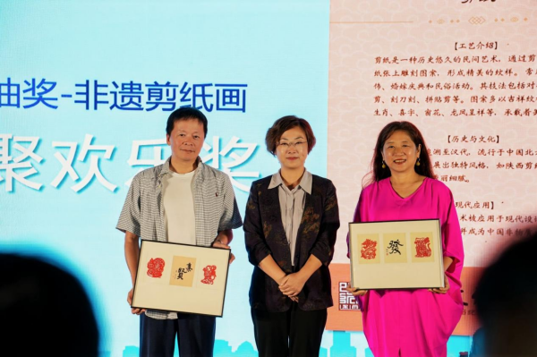 在活动尾声,市侨联党组书记杨雯懿,浦口区委常委、统战部部长刘园,分别抽取了“宁聚欢乐奖”“心悦浦口奖”幸运观众奖项,并向获奖嘉宾们赠送了非遗剪纸、烧箔画等翰墨艺术与非遗技艺完美融合的纪念品。通过本次活动的举办,让大家在领略非遗文化的同时,加强了侨联组织与侨界代表人士的联系,进一步助推中华优秀传统文化传播。