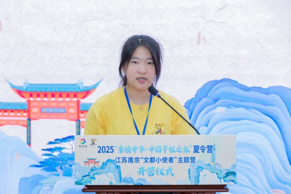 营员代表、来自西班牙孔子文化学校的刘嘉茜表达了对探寻南京这座历史文化名城的期待。她说,最好的课堂在路上,最美的成长在脚下,愿和营员们一起在南京结交新朋友,分享故事、共同成长,并向家人和朋友将讲述和传递在南京的所见所闻所感,做南京和世界交流互动的“文都小使者”。