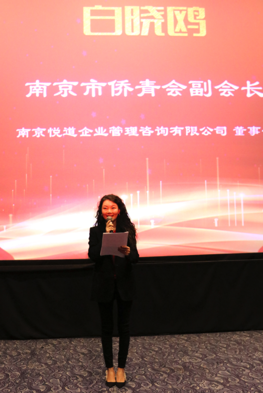 市侨青会副会长、南京悦道企业管理咨询有限公司董事长白晓鸥女士以自己回国创业的亲身经历,分享海外游子渴望回报祖国、参与祖国建设的赤子之情。